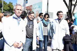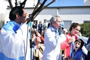 Portando banderas, pañuelos y globos celestes y tocando elementos de percusión, médicos y enfermeros, algunos vestidos con guardapolvos blancos y otros con uniformes verdes o azules, expresaron su rechazo al proyecto de ley que ya tiene media sanción de la Cámara de Diputados de la Nación y que será tratado en el Senado.