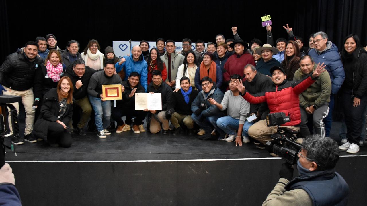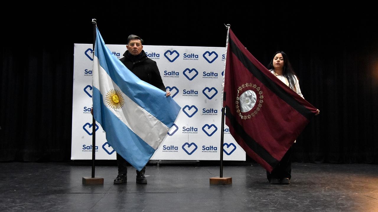 Durante el acto, los periodistas y cronistas de calle, Eduardo Lencina y Macarena Vaca portaron la bandera Argentina y de Salta.